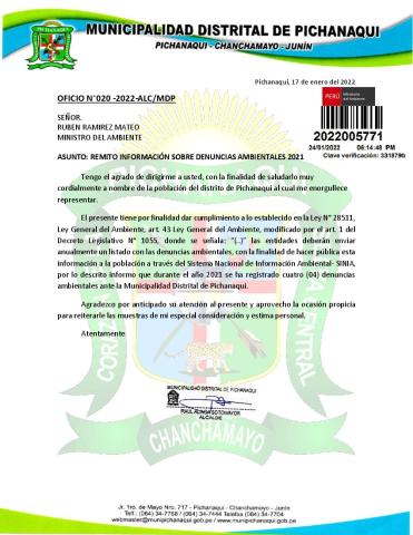 Información sobre denuncias ambientales 2021 de la Municialidad Distrital de Pichanaqui