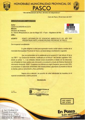 Información de denuncias ambientales del año 2020 de la Municipalidad Provincial de Pasco