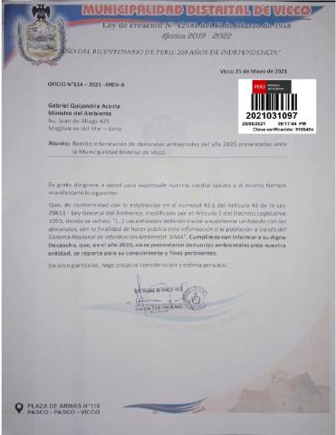 Información de denuncias ambientales presentadas el 2020 ante la Municipalidad Distrital de Vicco