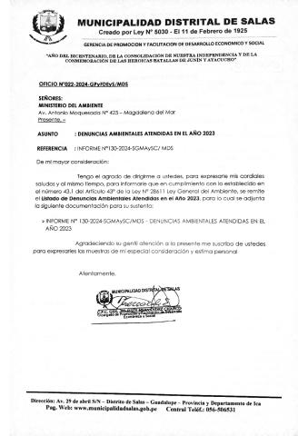 Informe Anual sobre reporte de denuncias ambientales hasta el año 2023 Municipalidad Distrital de Salas - Ica