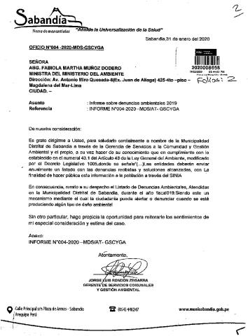 informe sobre denuncias ambientales 2019. Municipalidad Distrital de Sabandia