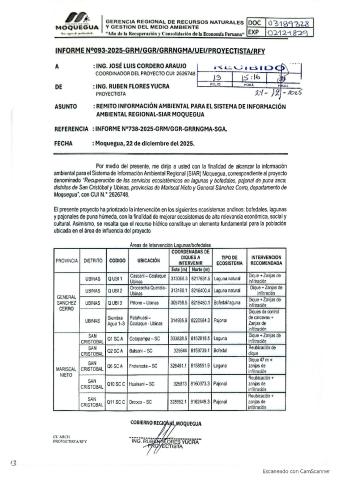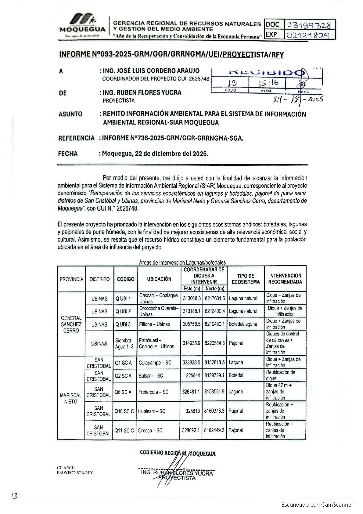 INFORME N°093-2025-GRM/GGR/GRRNGMA/UEI/PROYECTISTA/RFY "RECUPERACIÓN DE LOS SERVICIOS ECOSISTÉMICOS EN LAGUNAS Y BOFEDALES, PAJONALDE PUNA SECA, DISTRITOS DE SAN CRISTÓBAL Y UBINAS, PROVINCIAS DE MARISCAL NIETO Y GENERAL SÁNCHEZ CERRO, DPTO DE MOQUEGUA"