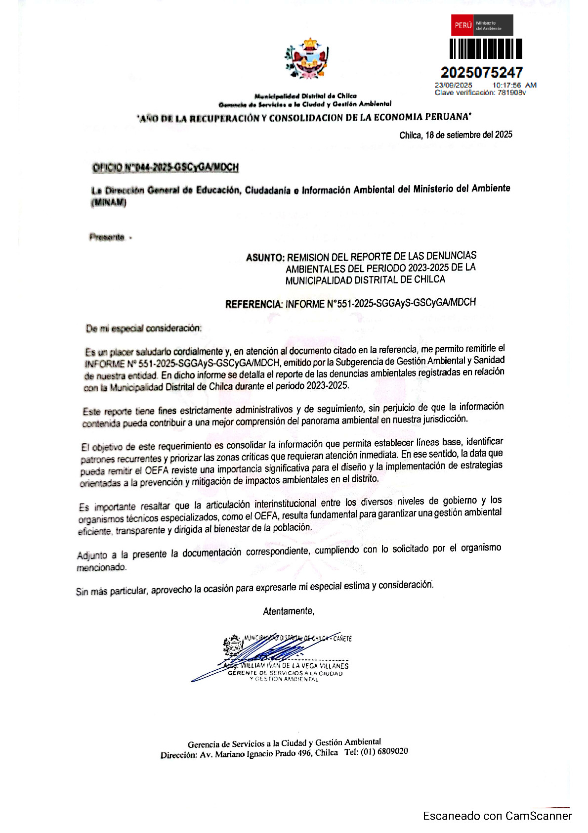 Informe sobre reporte de denuncias ambiental es anuales 2023-2025 Municipalidad Distrital de Chilca