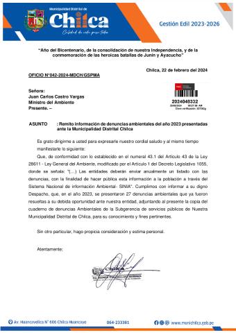 Informe sobre reporte de denuncias ambiental es anuales 2023 Municipalidad Distrital de Chilca