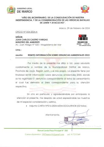 Informe sobre reporte de denuncias ambiental es anuales 2023 Municipalidad Distrital de Marco