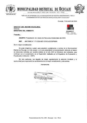 Informe sobre reporte de denuncias ambiental es anuales 2023 Municipalidad Distrital de Ocucaje