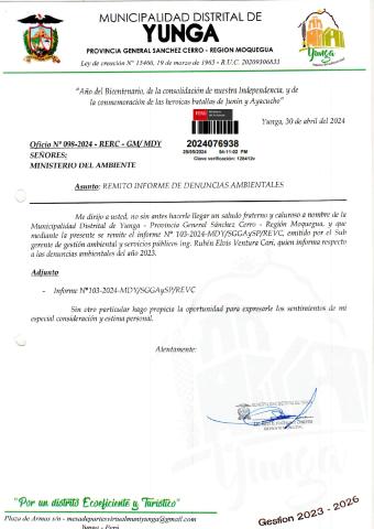 Informe sobre reporte de denuncias ambiental es anuales 2023 Municipalidad Distrital de Yunga