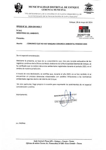 Informe sobre reporte de denuncias ambiental es anuales 2023 Municipalidad Distrital de Estique