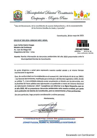 Informe sobre reporte de denuncias ambiental es anuales 2023 Municipalidad Distrital de Constitucion