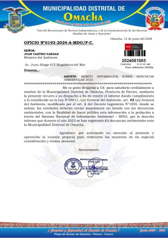 Informe sobre reporte de denuncias ambiental es anuales 2023 Municipalidad Distrital de Omacho
