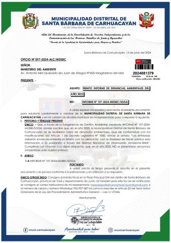 Informe sobre reporte de denuncias ambiental es anuales 2023 Municipalidad Distrital de Carhuacayan