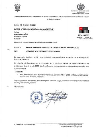 Informe sobre reporte de denuncias ambiental es anuales 2023 Municipalidad Provincial de Ocros