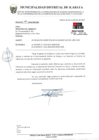 Informe sobre reporte de denuncias ambiental es anuales 2023 Municipalidad Distrital de Ilabaya