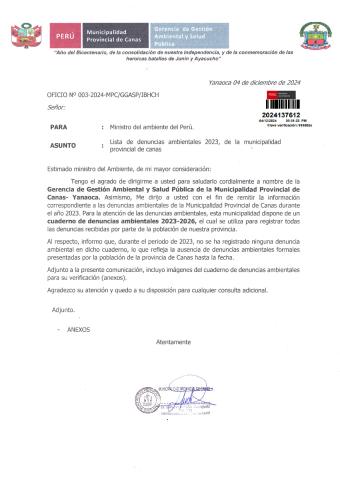 Informe sobre reporte de denuncias ambiental es anuales 2023 Municipalidad Provincial de Canas