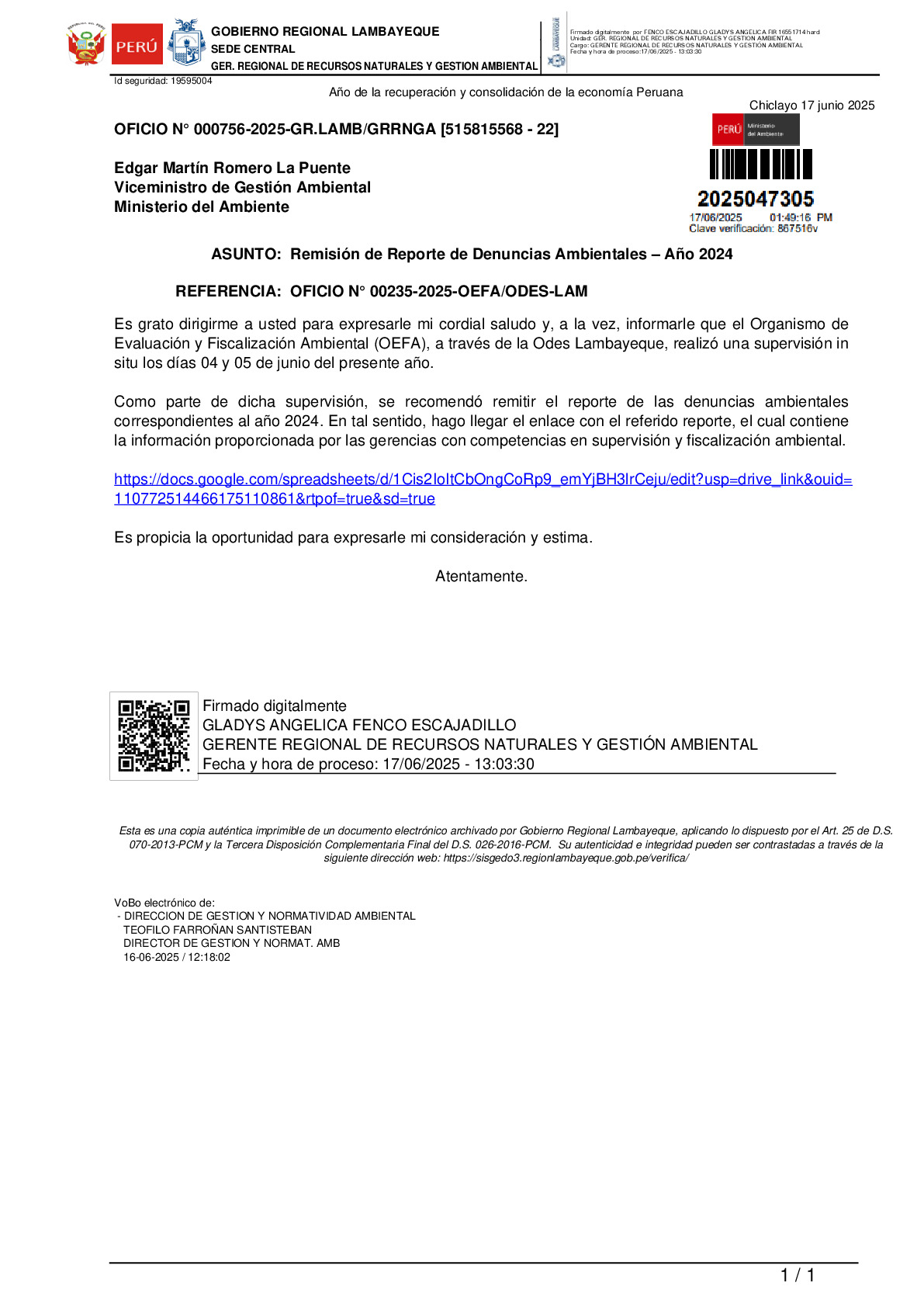 Informe sobre reporte de denuncias ambiental es anuales 2024 GORE Lambayeque