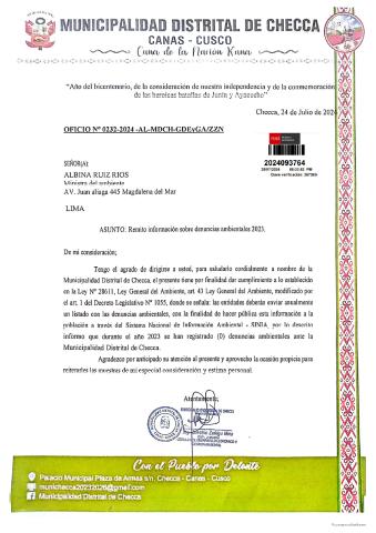 Informe sobre reporte de denuncias ambiental es anuales 2024 Municipalidad Distrital de Checca