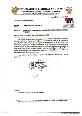 Informe sobre reporte de denuncias ambiental es anuales 2024 Municipalidad Distrital de Pararca