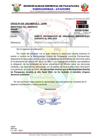 Informe sobre reporte de denuncias ambiental es anuales 2024 Municipalidad Distrital de Pacapausa