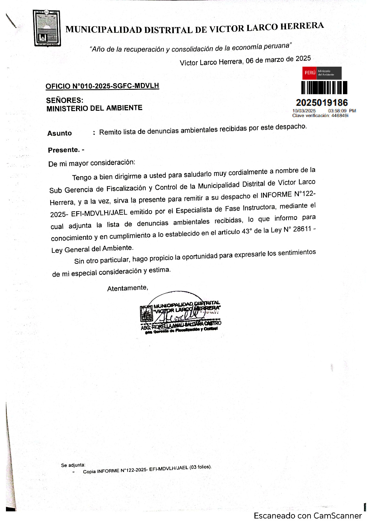 En cumplimiento de lo establecido en el Decreto Legislativo N° 1055 que modifica el artículo 43° de la Ley N° 28611, que indica que "Las entidades deberán enviar anualmente un listado con las denuncias recibidas y soluciones alcanzadas, con la finalidad de hacer pública esta información a la población a través del SINIA".