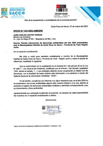 Informe sobre reporte de denuncias ambiental es anuales 2024 Municipalidad Distrital de Santa Rosa de Sacco