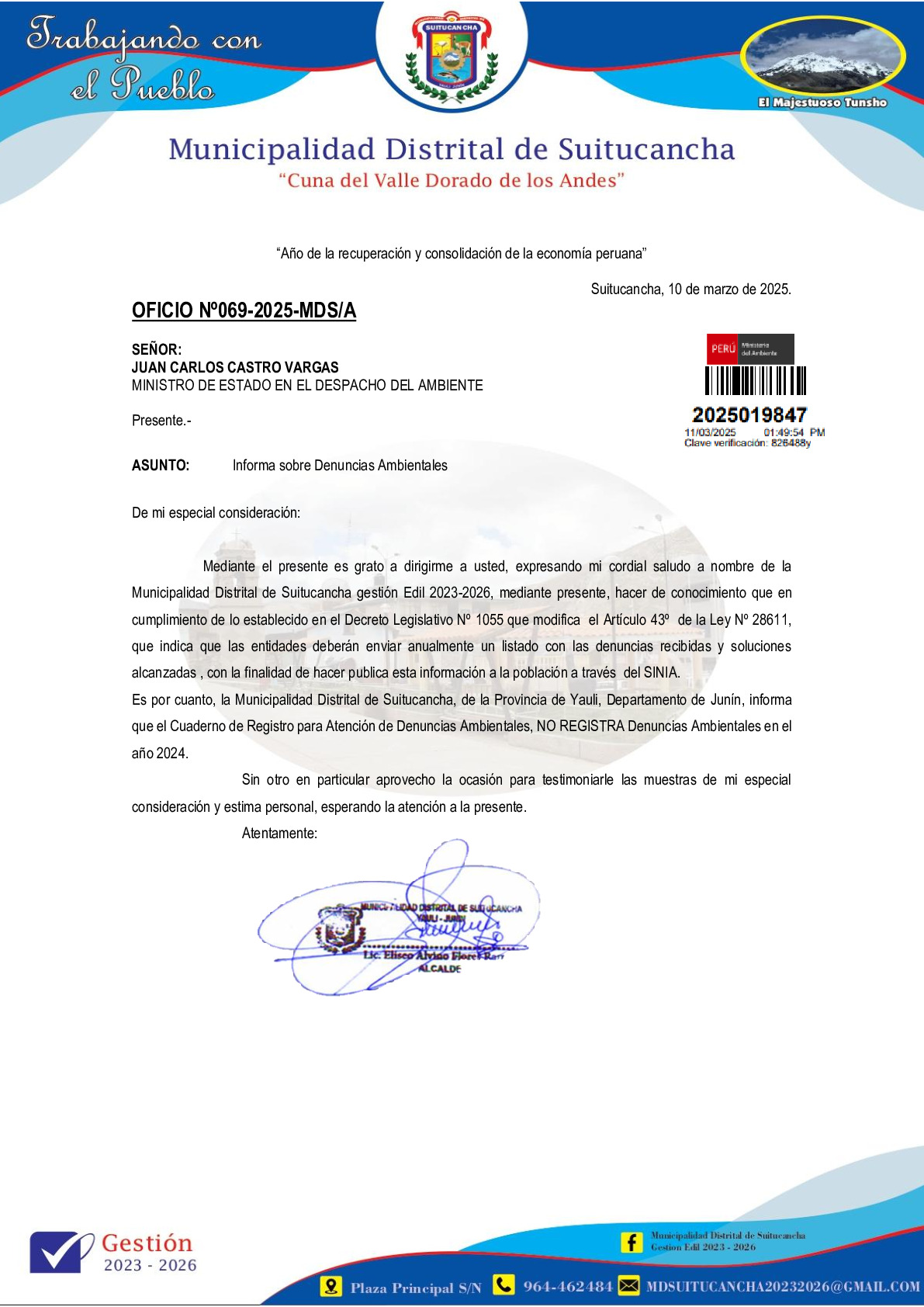 Informe sobre reporte de denuncias ambiental es anuales 2024 Municipalidad Distrital de Suitucancha