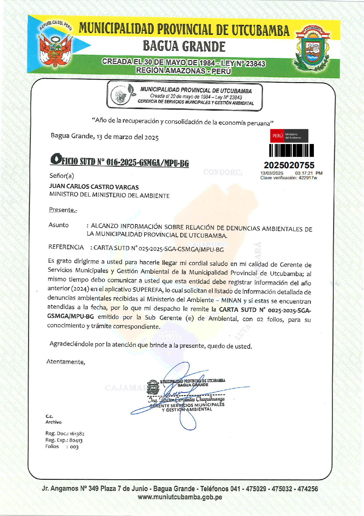 Informe sobre reporte de denuncias ambiental es anuales 2024 Municipalidad Distrital de Utcubamba