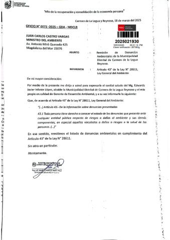 Informe sobre reporte de denuncias ambiental es anuales 2024 Municipalidad Distrital de Carmen de la Legua