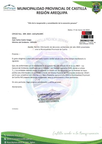 Informe sobre reporte de denuncias ambiental es anuales 2024 Municipalidad Provincial de Castilla