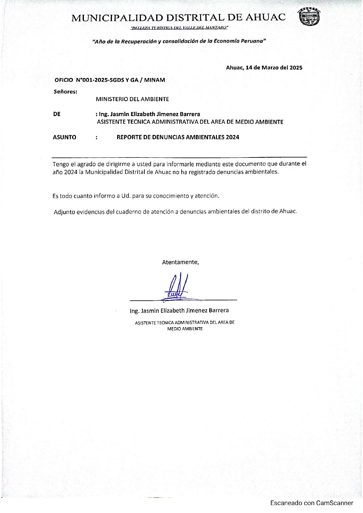 Informe sobre reporte de denuncias ambiental es anuales 2024 Municipalidad Distrital de Ahuac