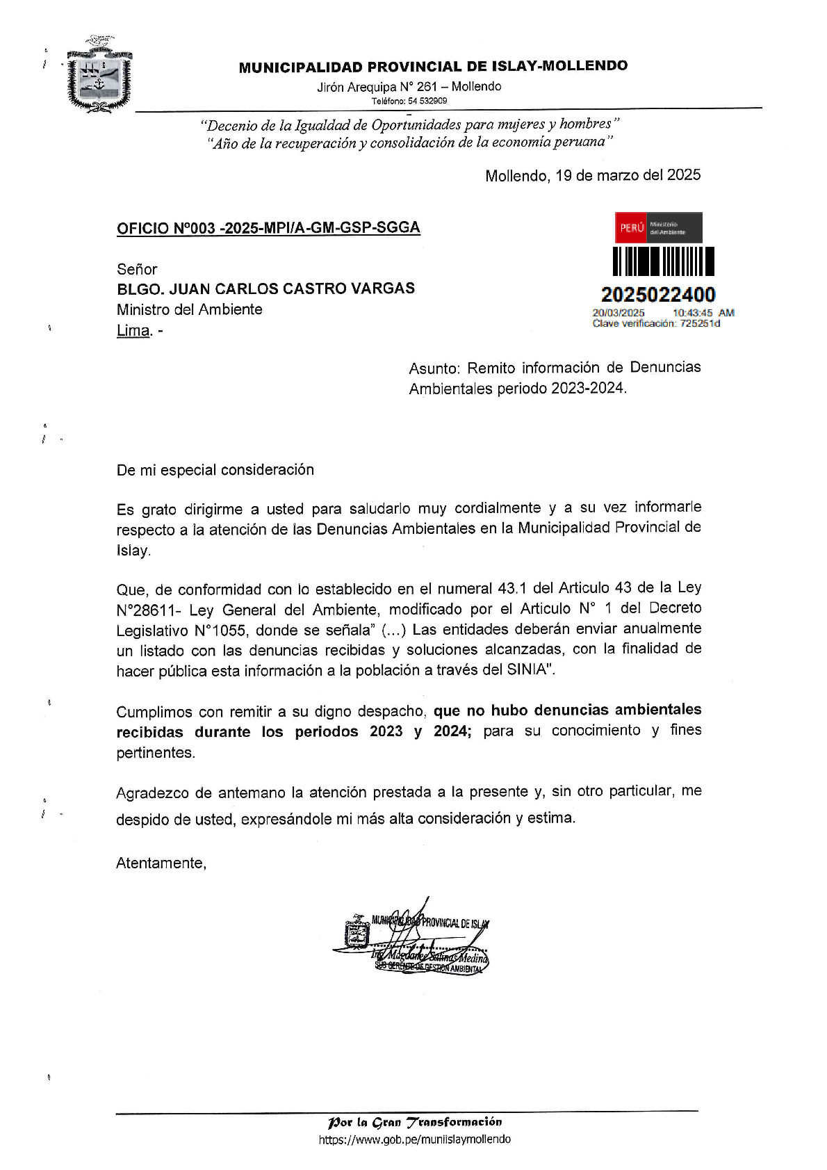 Informe sobre reporte de denuncias ambiental es anuales 2024 Municipalidad Distrital de Islay