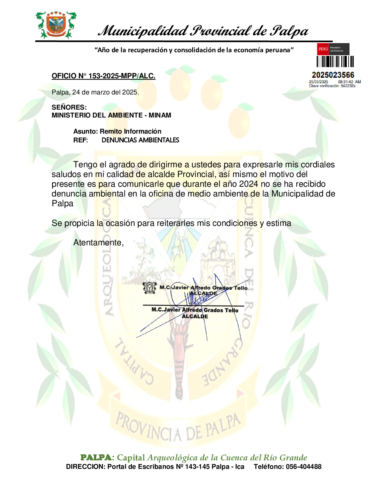 Informe sobre reporte de denuncias ambiental es anuales 2024 Municipalidad Provincial de Palpa