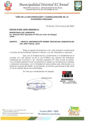 Informe sobre reporte de denuncias ambiental es anuales 2024 Municipalidad Distrital de Arenal