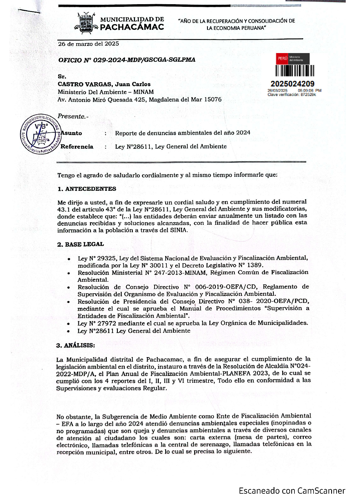 Informe sobre reporte de denuncias ambiental es anuales 2024 Municipalidad Provincial del Pachacamac