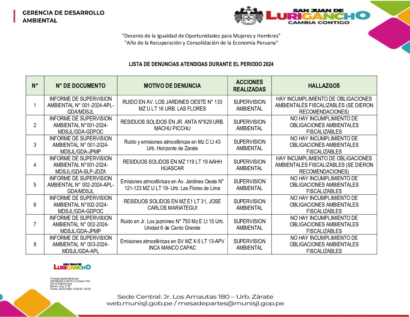 Informe sobre reporte de denuncias ambiental es anuales 2024 Municipalidad Distrital de San Juan de Lurigancho