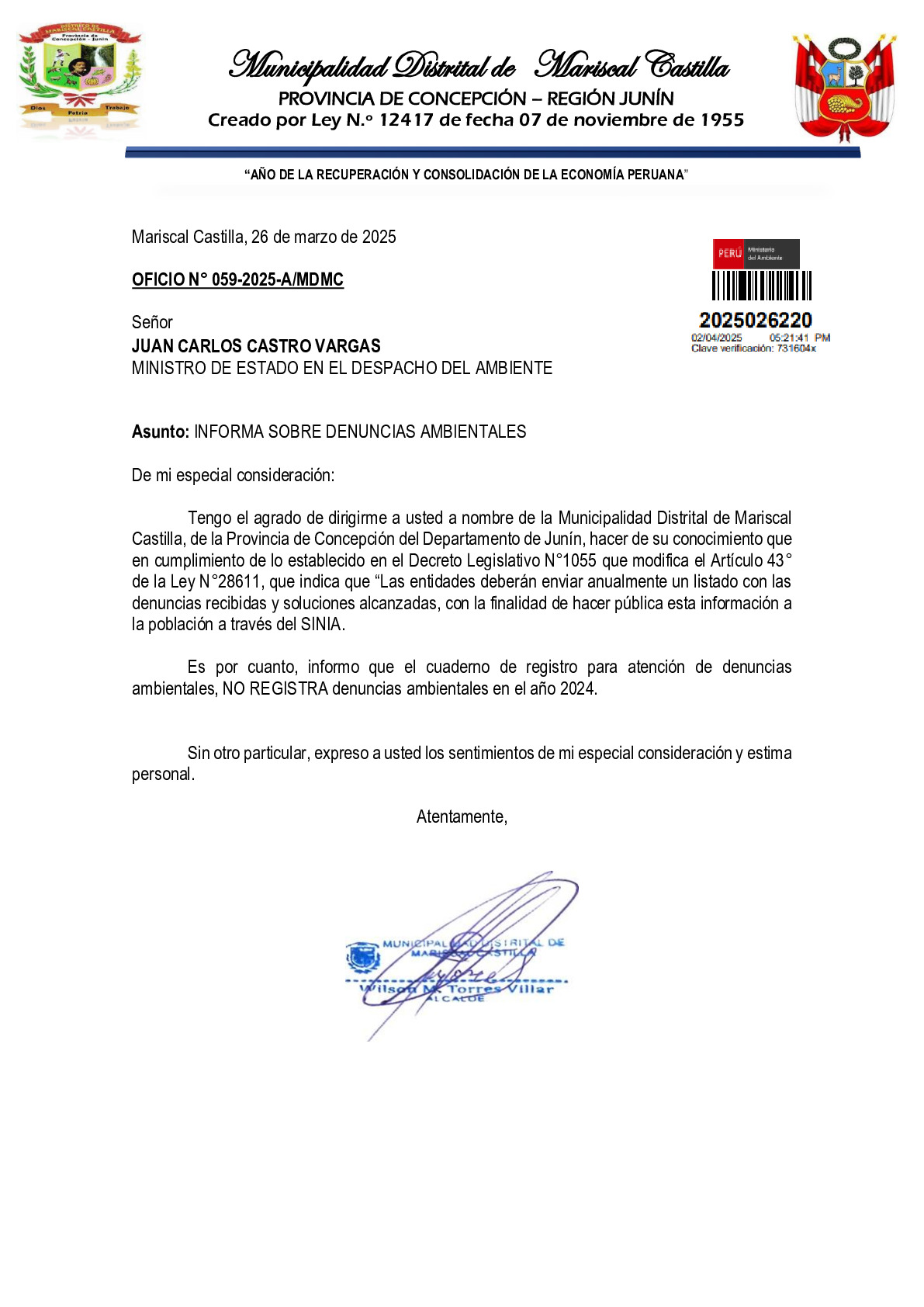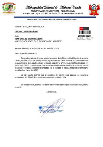 Informe sobre reporte de denuncias ambiental es anuales 2024 Municipalidad Distrital de Mariscal Castilla