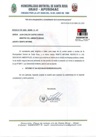 Informe sobre reporte de denuncias ambiental es anuales 2024 Municipalidad Distrital de Santa Rosa