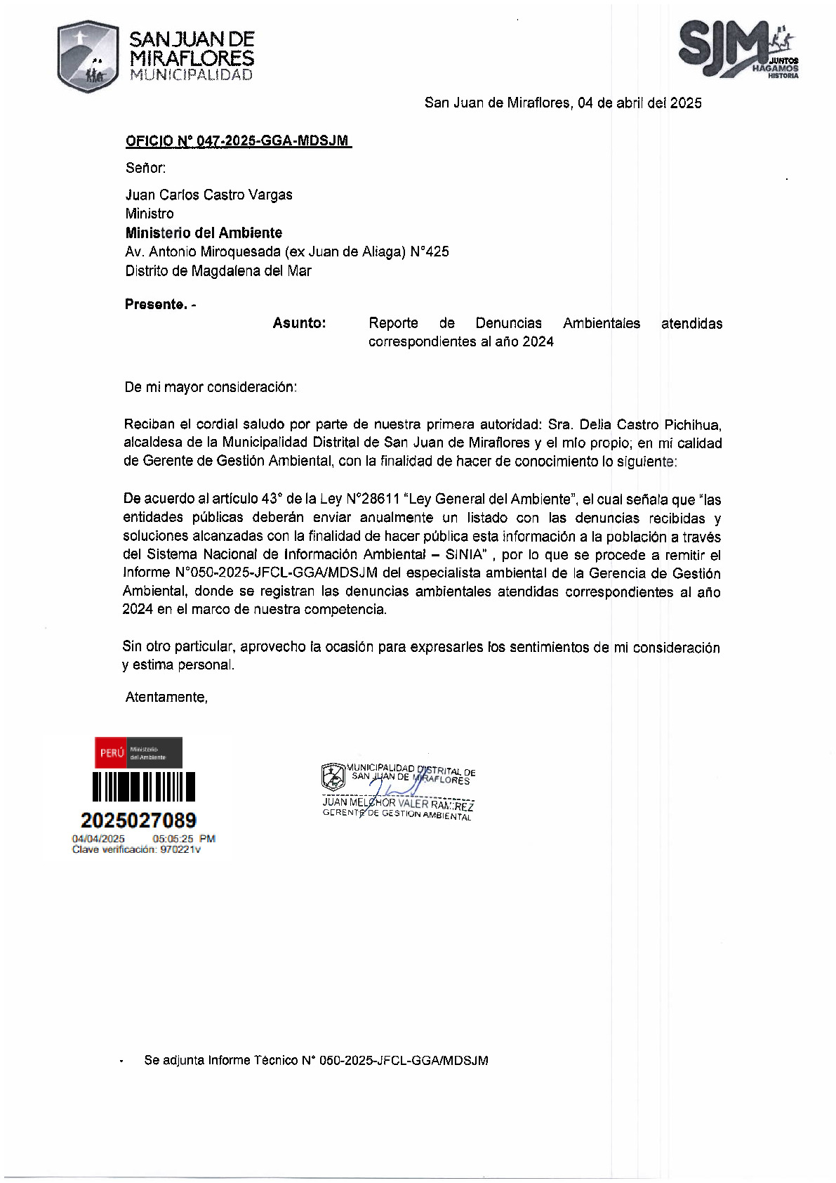Informe sobre reporte de denuncias ambiental es anuales 2024 Municipalidad Distrital de San juan de Miraflores