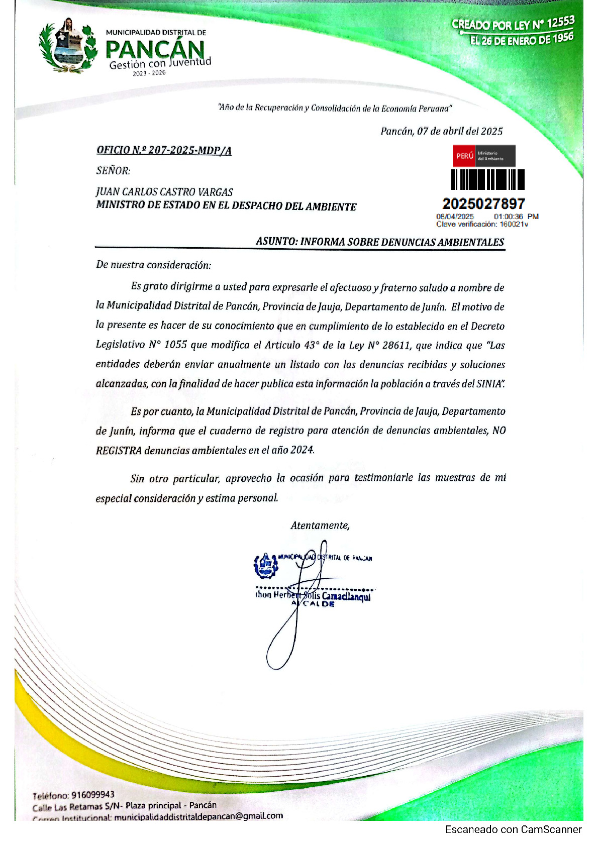 Informe sobre reporte de denuncias ambiental es anuales 2024 Municipalidad Distrital de Pancan