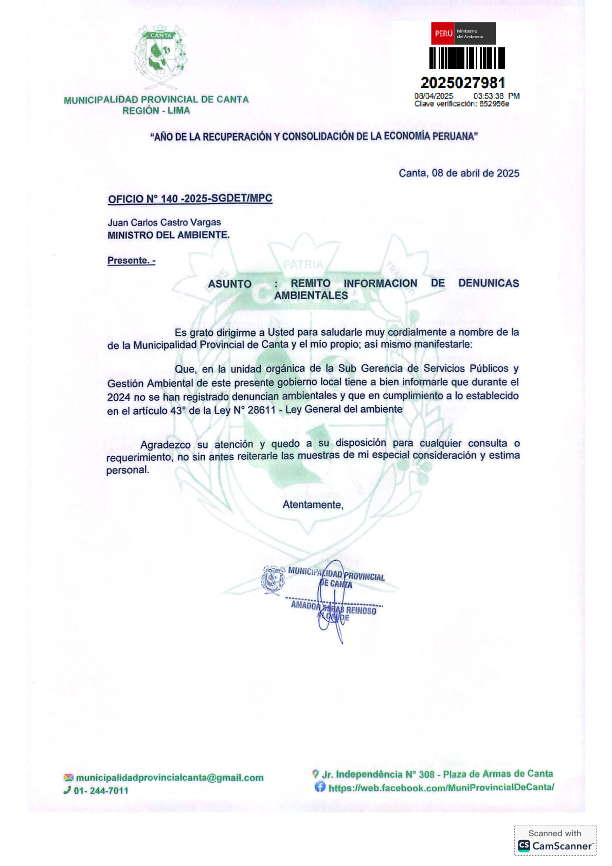 Informe sobre reporte de denuncias ambiental es anuales 2024 Municipalidad Provncial de Canta