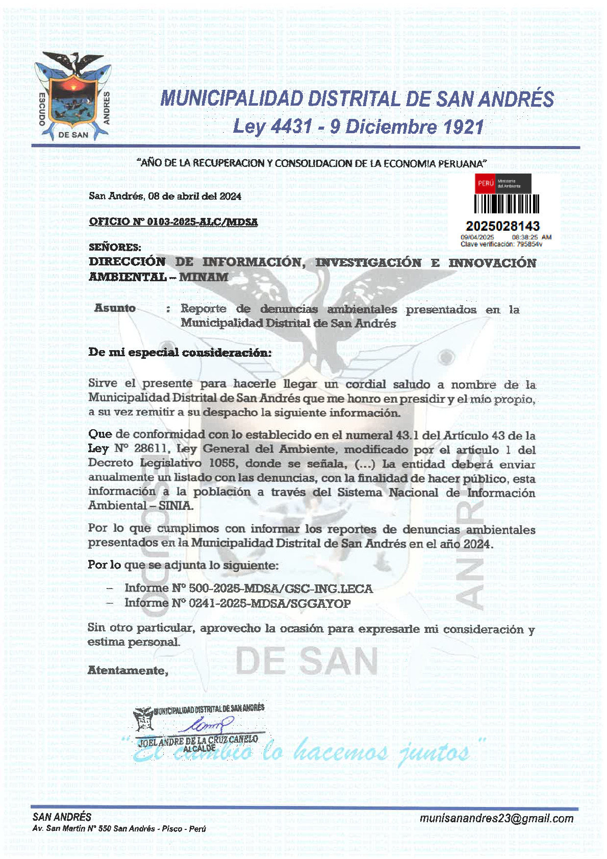 Informe sobre reporte de denuncias ambiental es anuales 2024 Municipalidad Distrital de San Andres