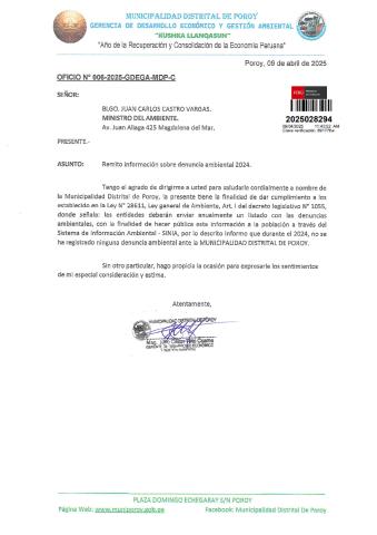 Informe sobre reporte de denuncias ambiental es anuales 2024 Municipalidad Distrital de Poroy
