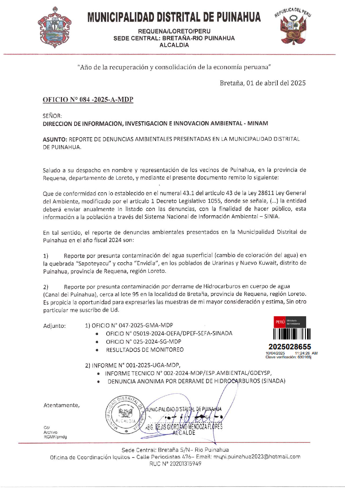 Informe sobre reporte de denuncias ambiental es anuales 2024 Municipalidad Distrital de Puinahua