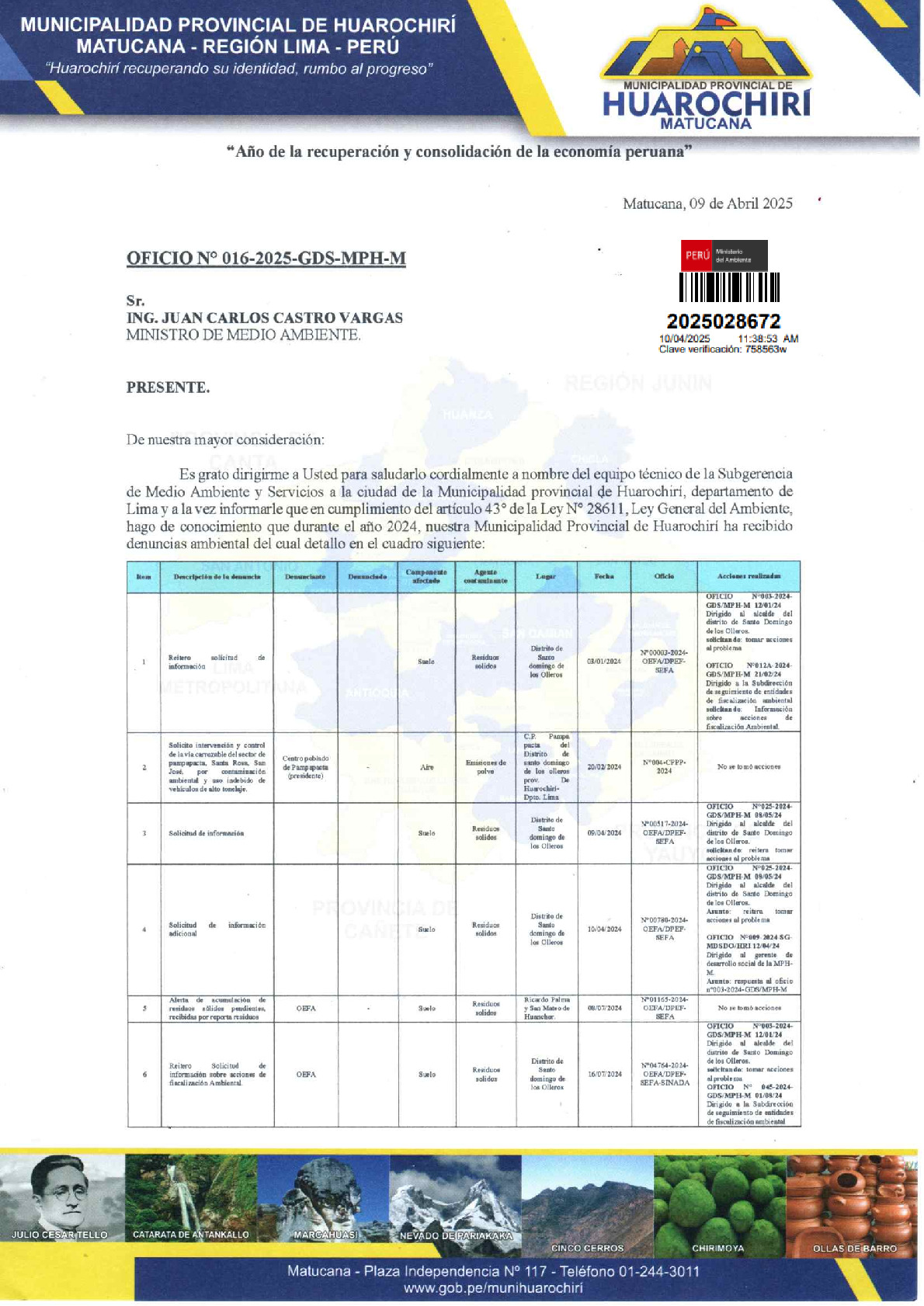 Informe sobre reporte de denuncias ambiental es anuales 2024 Municipalidad Distrital de Huarochiri