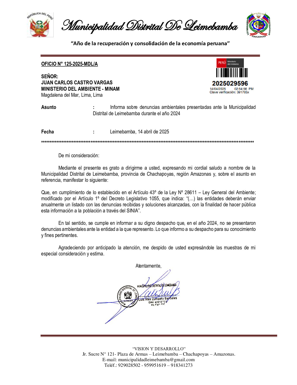 Informe sobre reporte de denuncias ambiental es anuales 2024 Municipalidad Distrital de Leimebamba