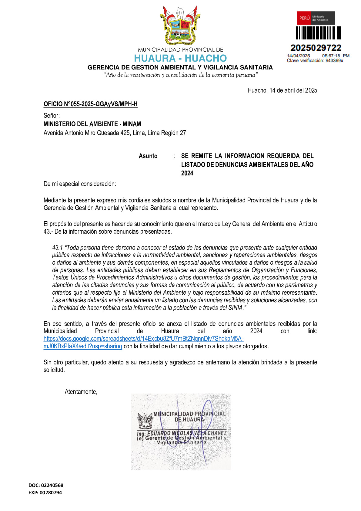 Informe sobre reporte de denuncias ambiental es anuales 2024 Municipalidad Provincial de Huaura