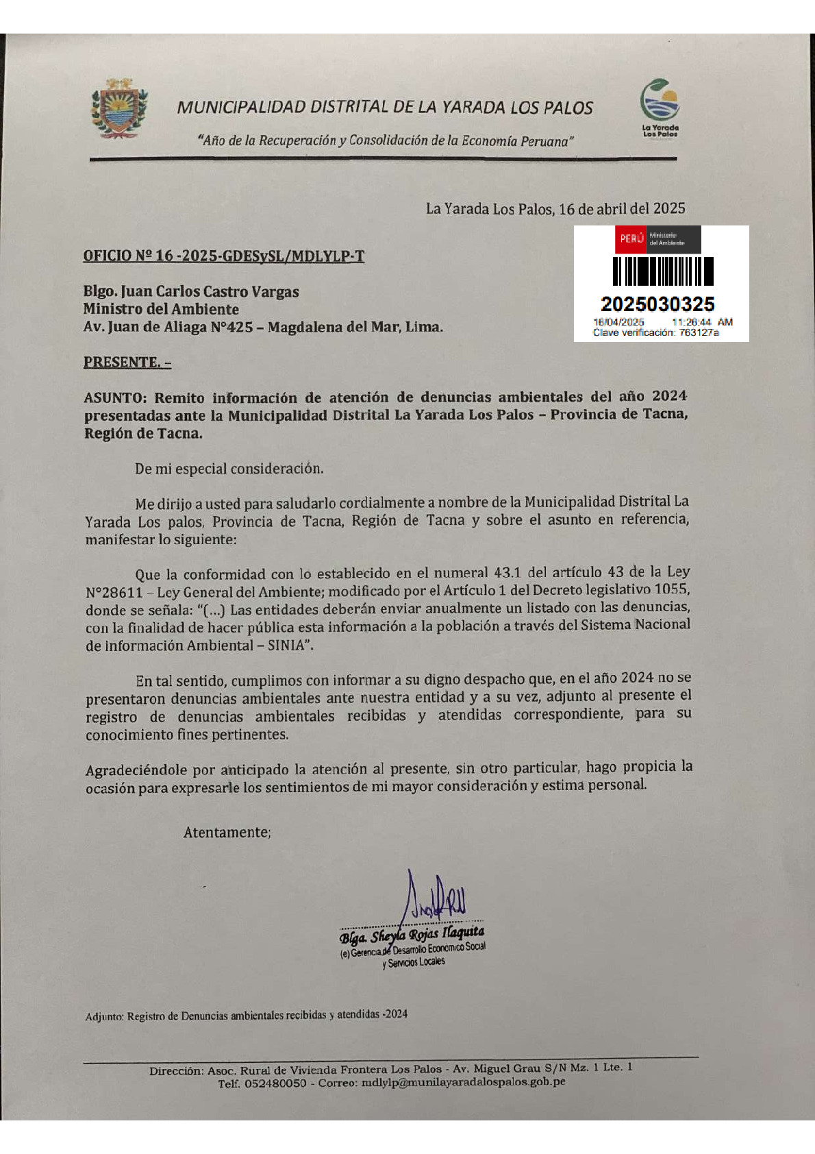 Informe sobre reporte de denuncias ambiental es anuales 2024 Municipalidad Distrital de Yarada los Palos