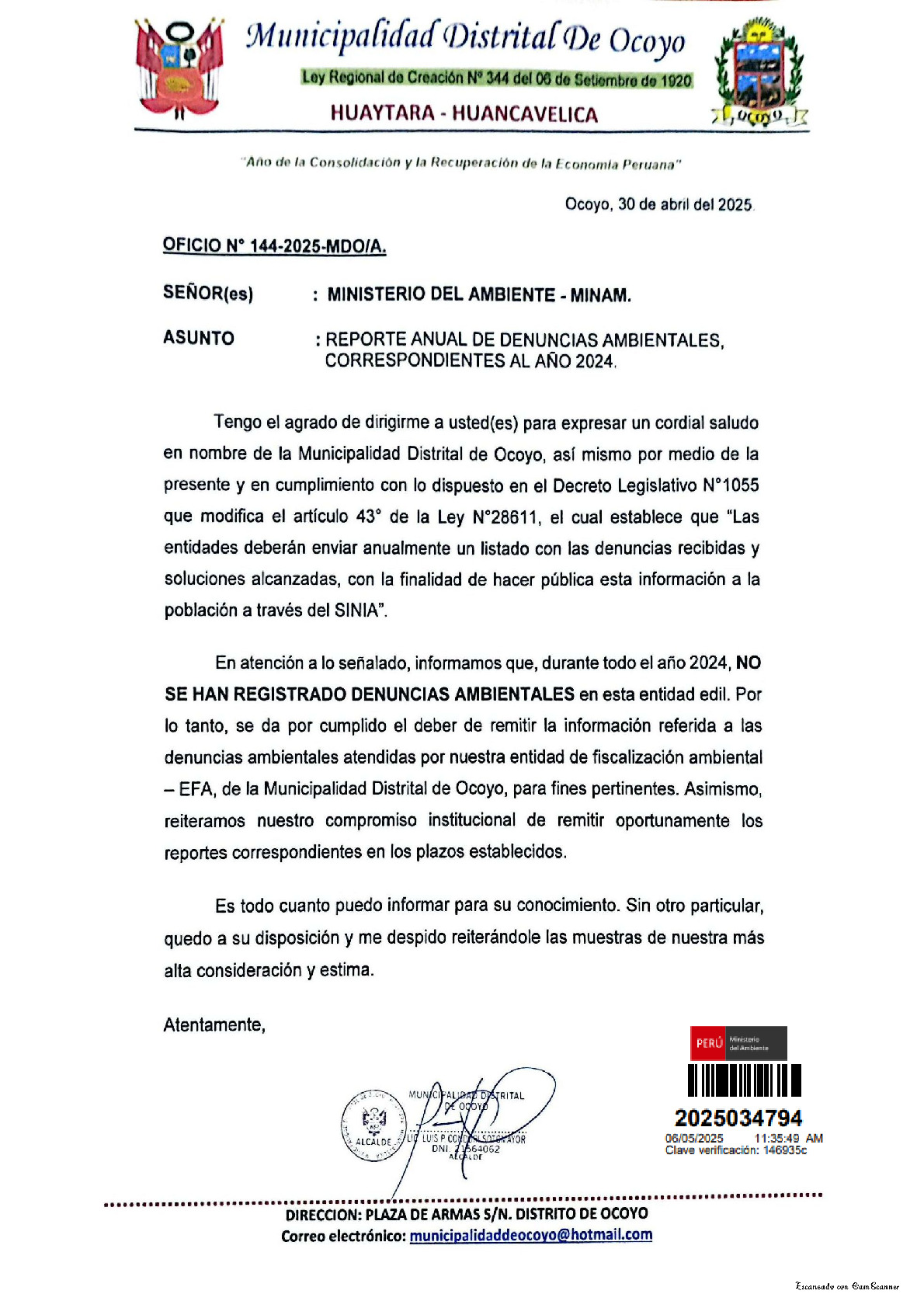 Informe sobre reporte de denuncias ambiental es anuales 2024 Municipalidad Distrital de Ocoyo