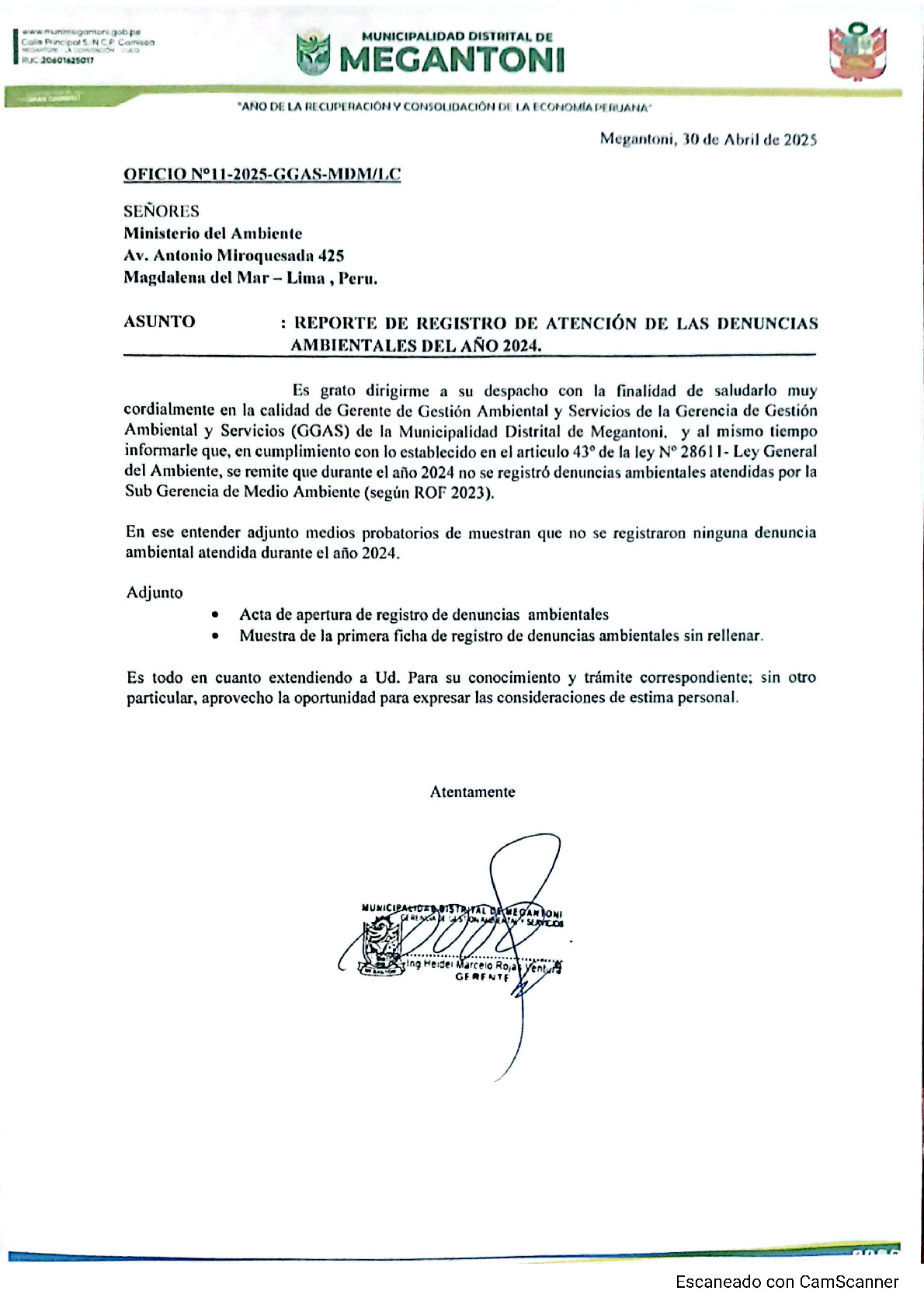 Informe sobre reporte de denuncias ambiental es anuales 2024 Municipalidad Distrital de Megantoni
