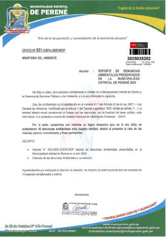 Informe sobre reporte de denuncias ambiental es anuales 2024 Municipalidad Distrital de Perene