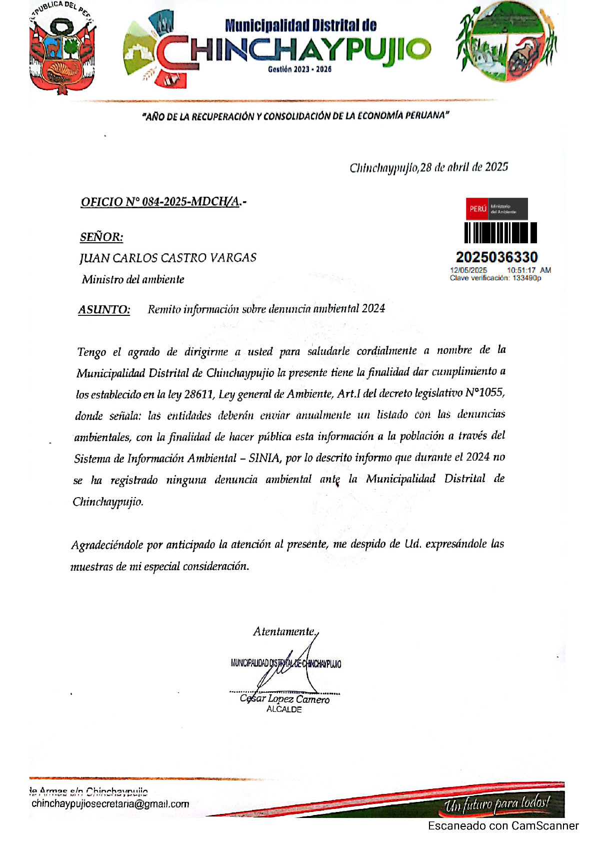 Informe sobre reporte de denuncias ambiental es anuales 2024 Municipalidad Provincial de Chinchaypujio